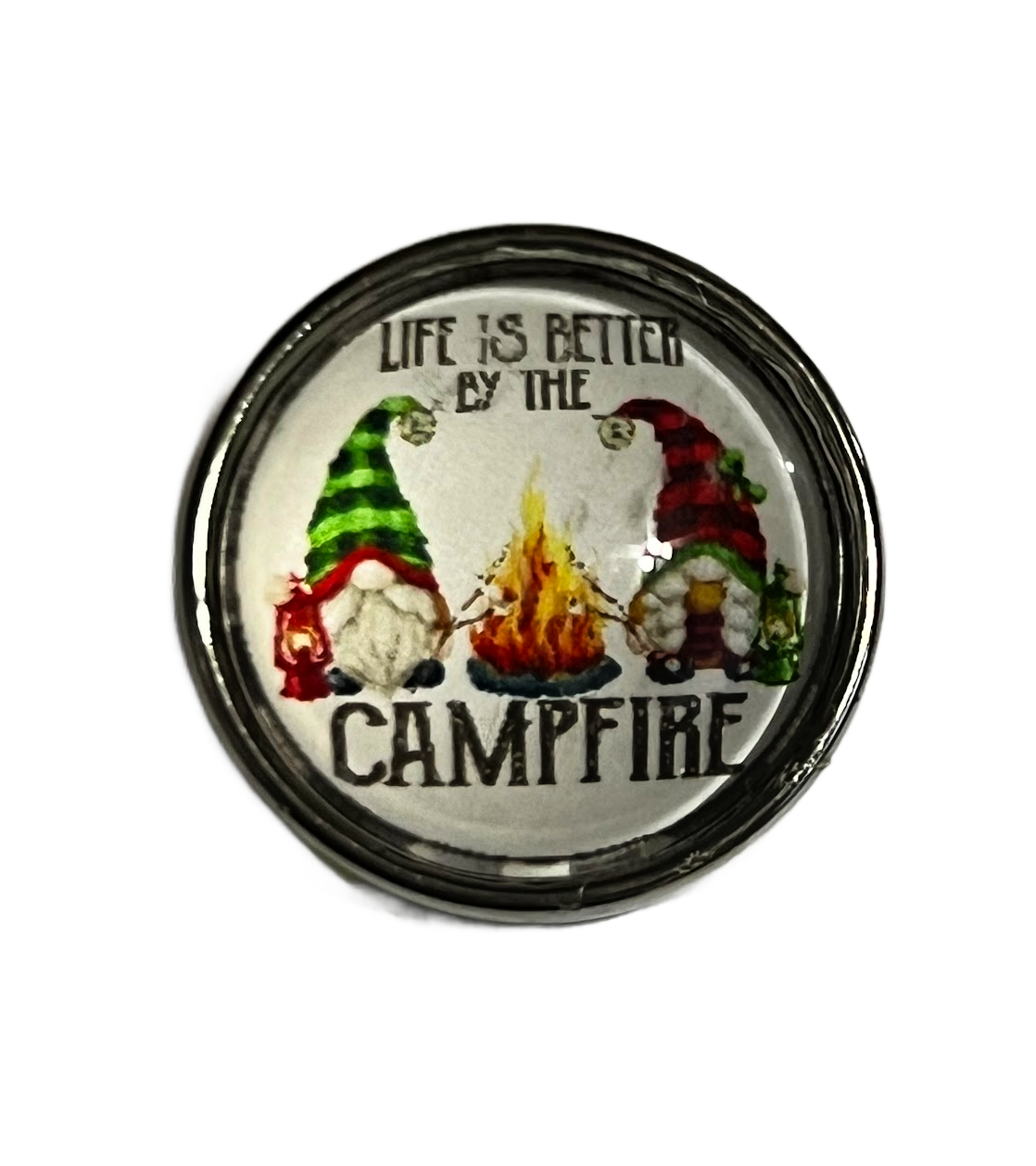 This 20mm glass snap charm features a charming design of gnomes sitting around a campfire, with the phrase "Life is Better By The Campfires" written in cursive. Add it to your snap charm jewelry collection for a cute and whimsical touch. Show off your love for camping and outdoor adventures with this unique snap charm.